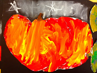 Last week the kids drew their pumpkins with black oil pastel, then filled in the pumpkins with RED paint.